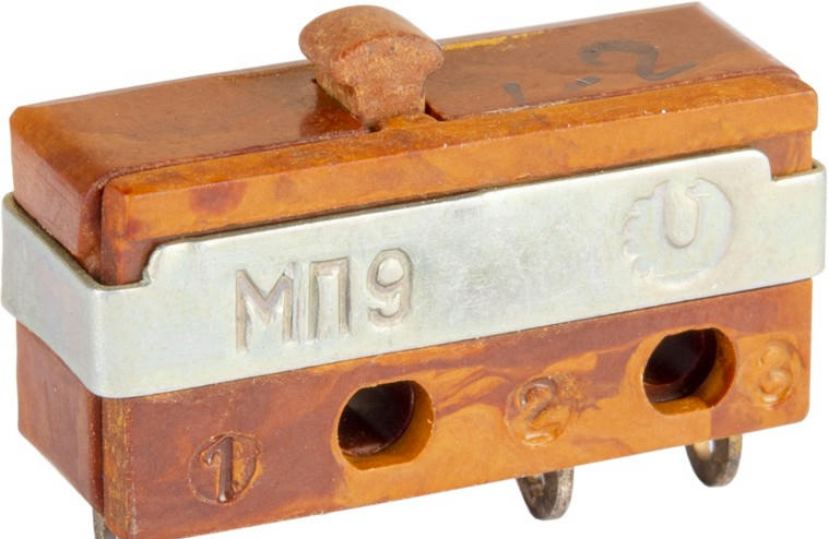Миниатюрный однополюсный микропереключатель МП9 с одинарным разрывом цепи, применяется в системах управления и сигнализации для коммутации электрических цепей постоянного и переменного тока в радиоэлектронной аппаратуре. Контактная группа микропереключателей выполняет функцию переключения с одного направления цепи на другое. Микропереключатели выполнены в карболитовых корпусах и крепятся путём фиксации в отверстиях на панели с помощью винтового соединения. Конструкция контактных выводов обеспечивает подсоединение монтажных проводов при помощи пайки. Степень защиты IP40. Выпускается в климатическом исполнении УХЛ и В.